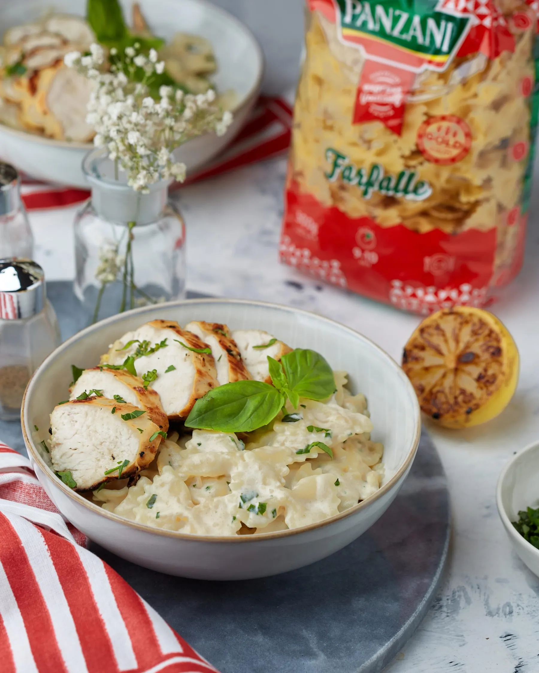 Na servírovací talíř dejte těstoviny s krémovou omáčkou a navrch umístěte jedno orestované kuřecí prsíčko.